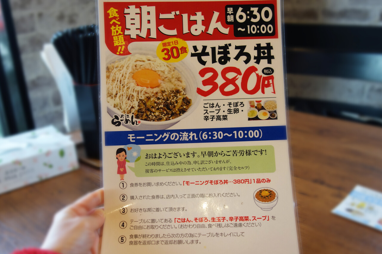 こちらは朝6時半から営業されており、モーニングで『そぼろ丼食べ放題』380円(限定数)を提供されております。