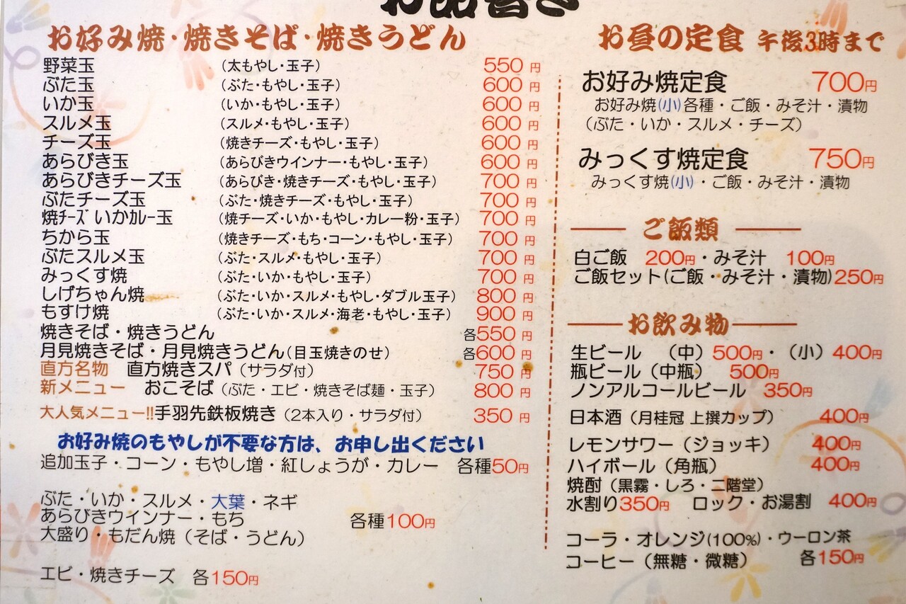 お好み焼きは一番安い『野菜玉』が550円、一般的に人気の『ぶた玉』は600円です。