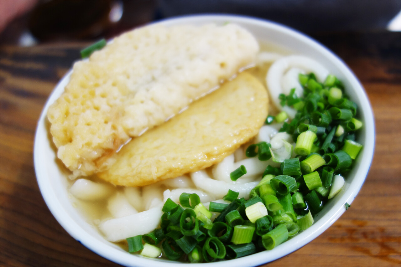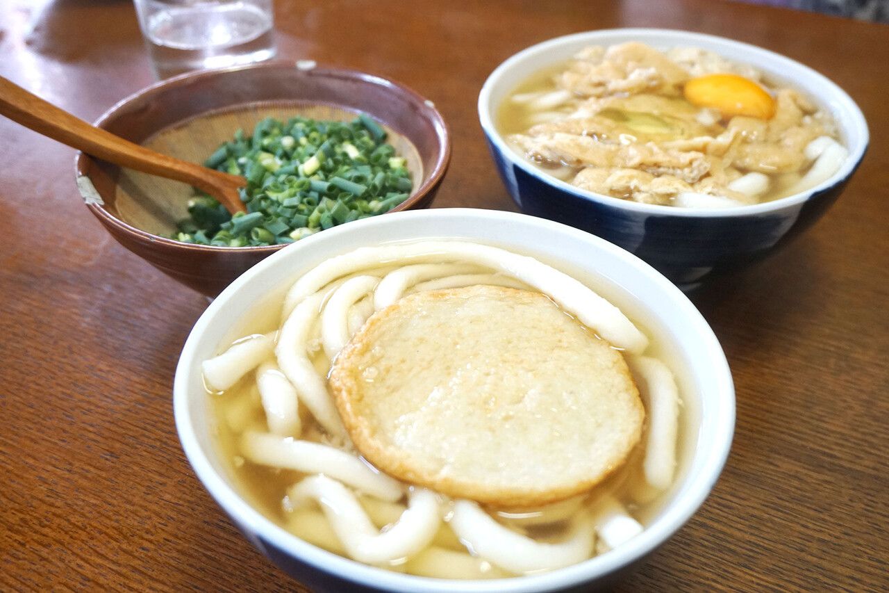 こちらは前回頂いたもので、丸天うどん(かけうどん+丸天)500円ときつね玉子うどん(かけうどん+きつね+玉子)600円です。