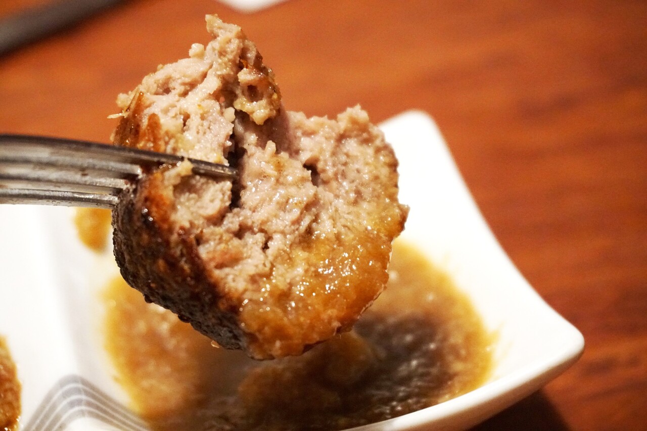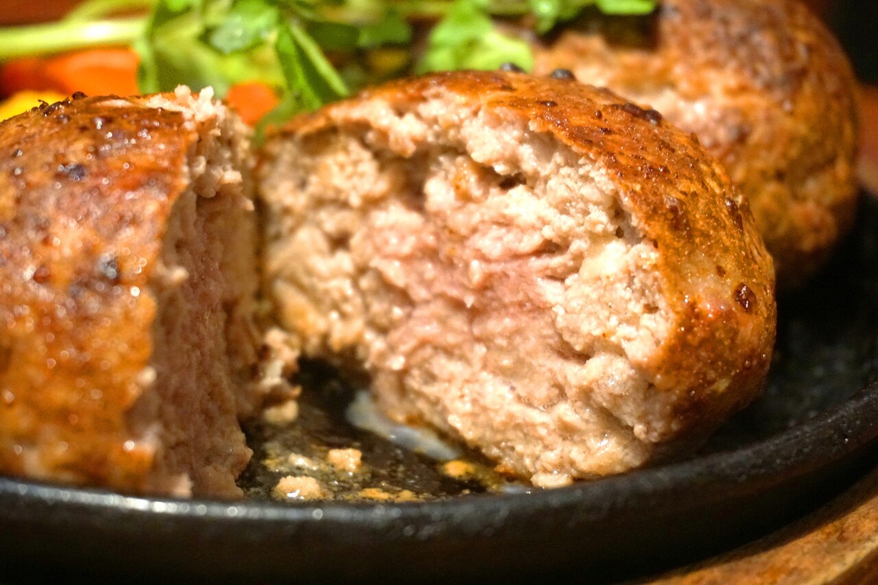 ひき肉をぎゅうぎゅうに固めた肉肉しさ満点のハンバーグは、ナイフを入れると肉汁が噴水のように溢れ出します。