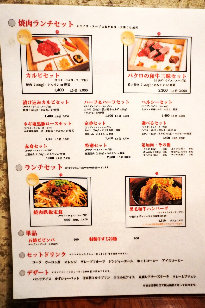 今回は『カルビセット(1.5倍)』2,000円・『黒毛和牛ハンバーグ(ダブル)』1,870円を頂きました。