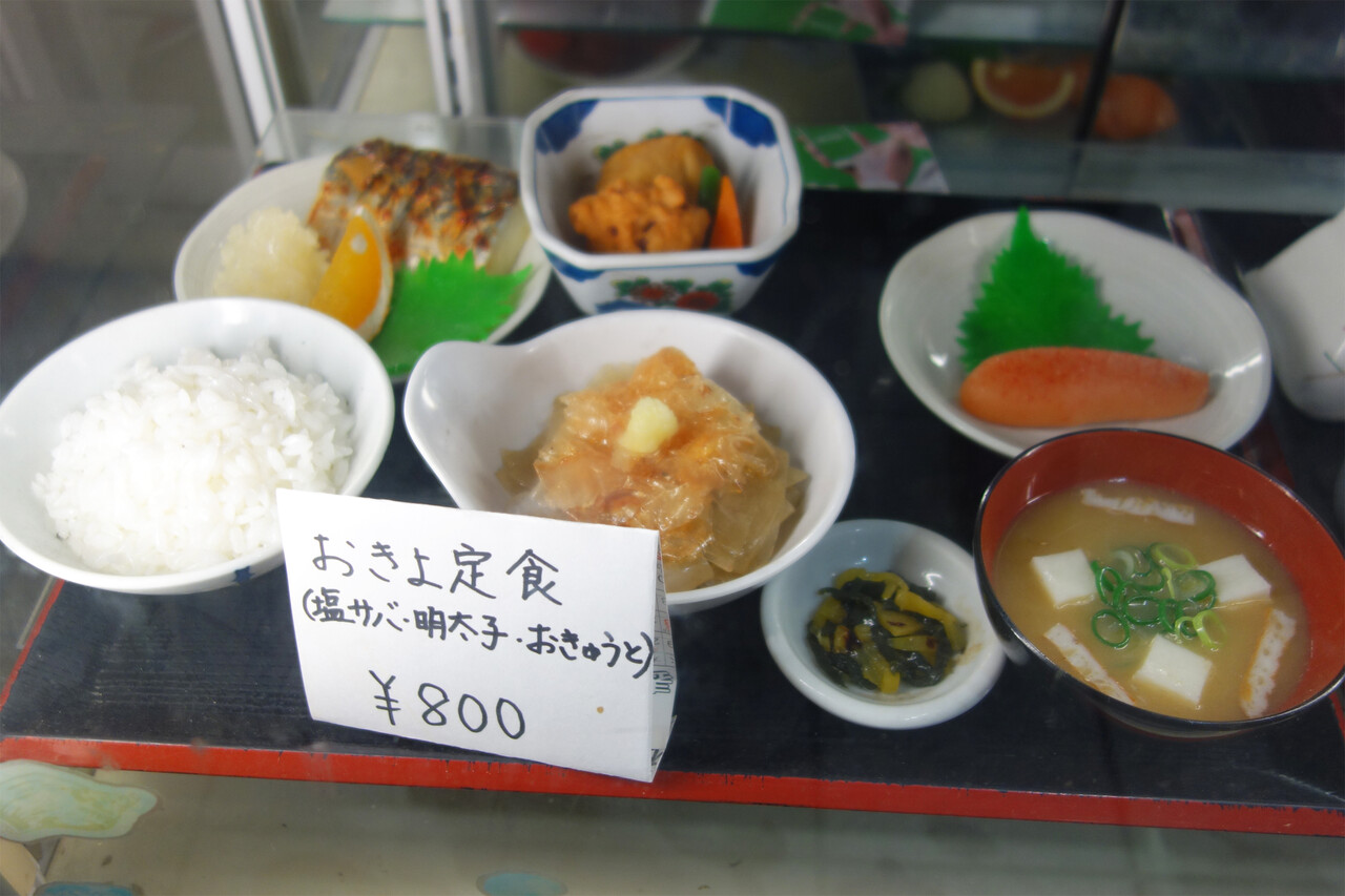 博多名物の明太子、郷土食のおきゅうと(海藻を固めた加工食品)が付いた『おきよ定食』800円もあります。