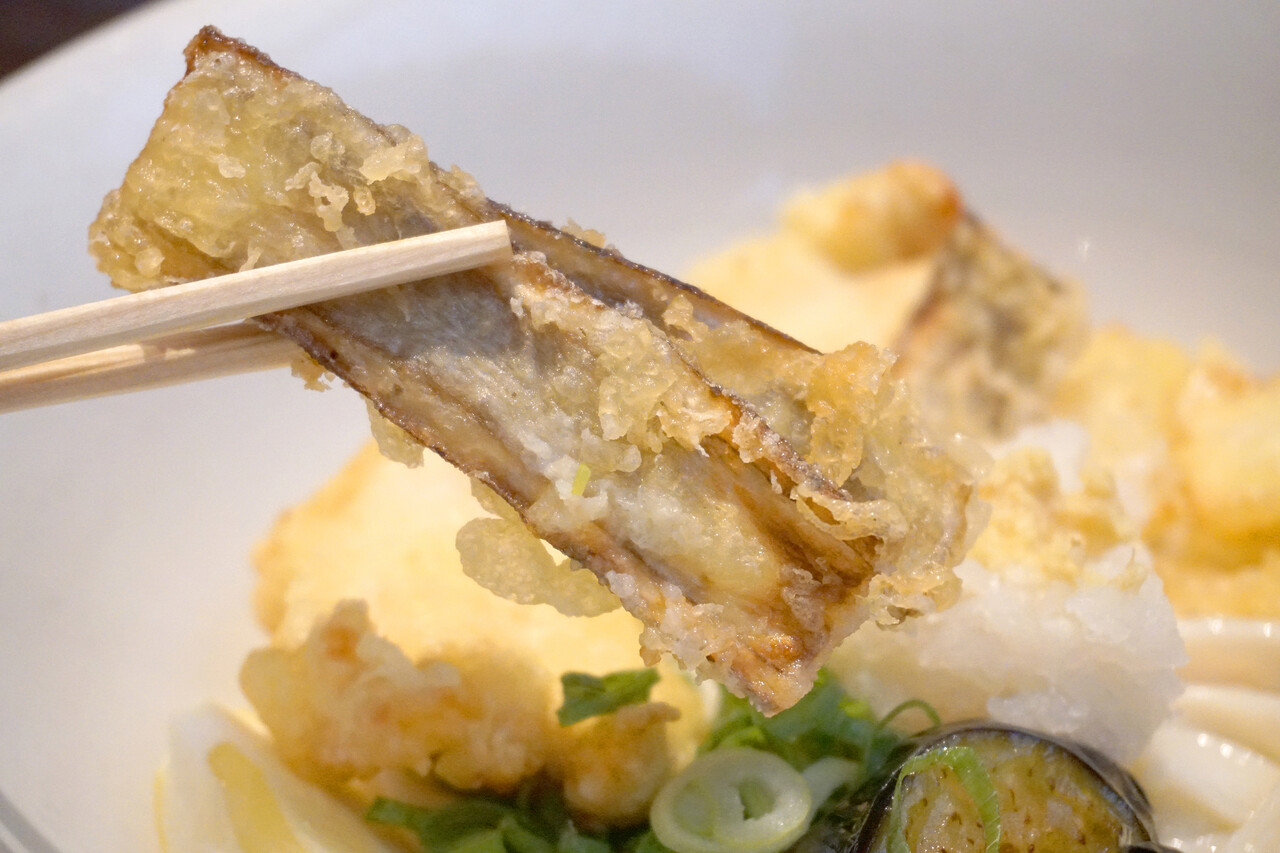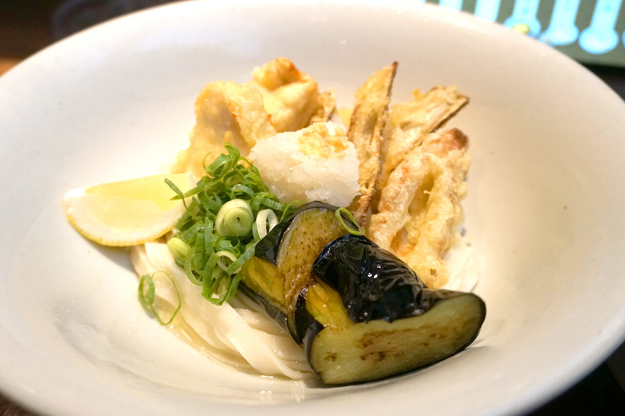 トッピングは、とり天・ごぼう天・茄子の素揚げ・ちくわ天・玉ねぎ天・大根おろし・ネギ・レモンです。
