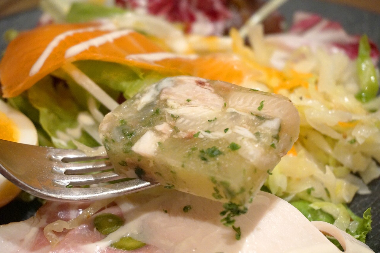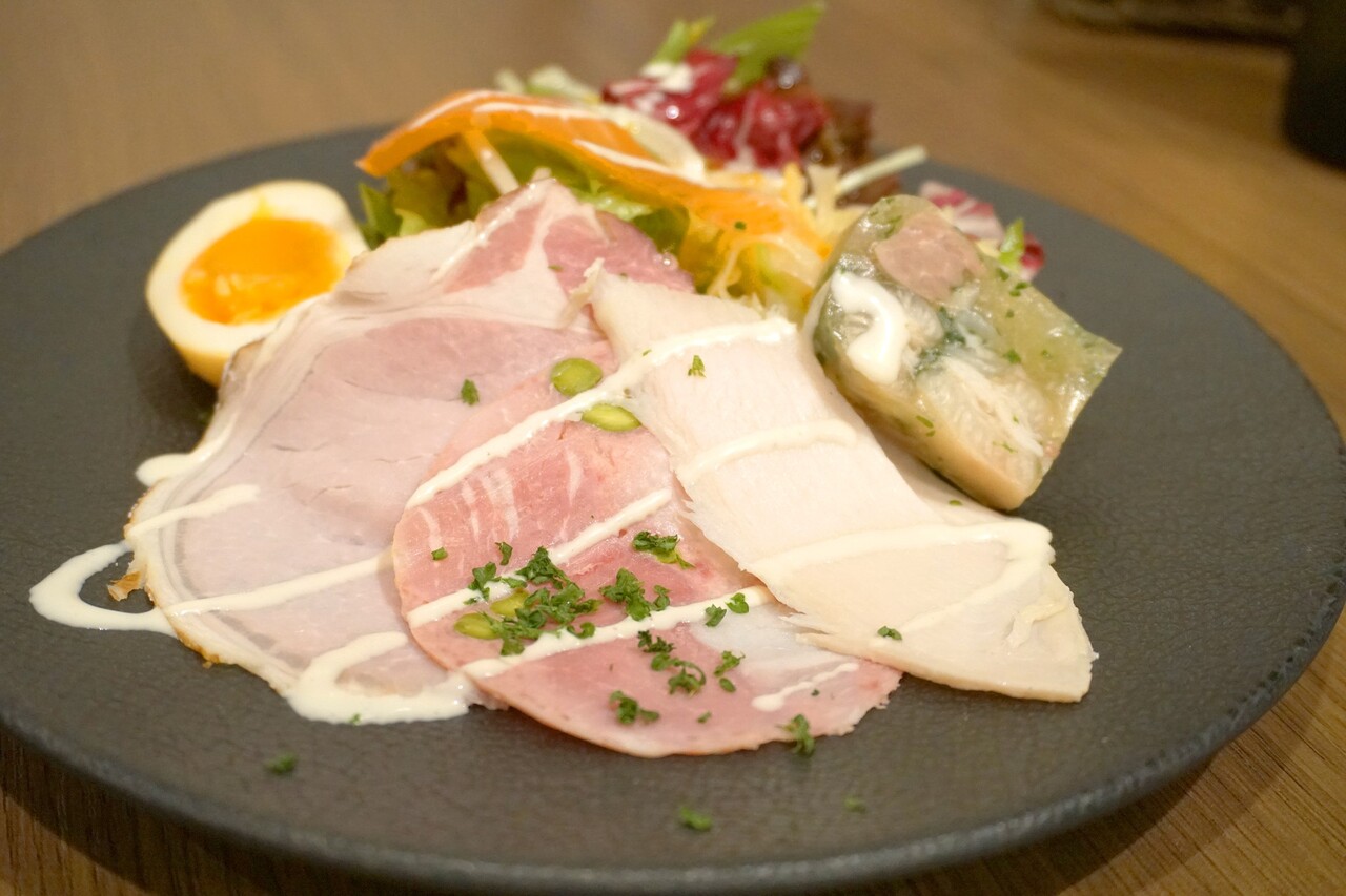 生ハムやテリーヌが美しく盛り付けられ、ワインを飲みたくなる逸品です。