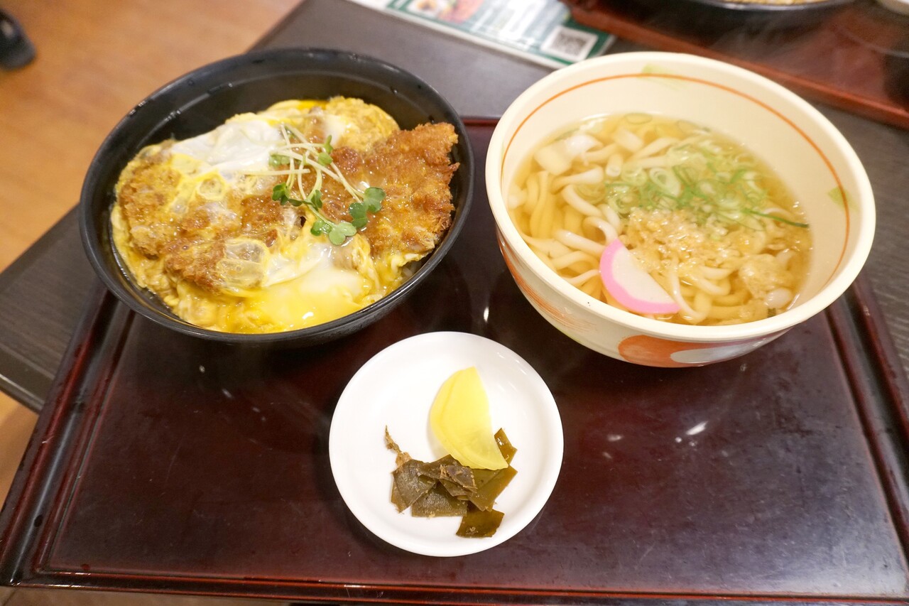 最優秀福岡市長賞を受賞したブランドポーク『とびうめ豚』を使用したカツ丼とかけうどんのセット(うどんはそばにも変更可)。