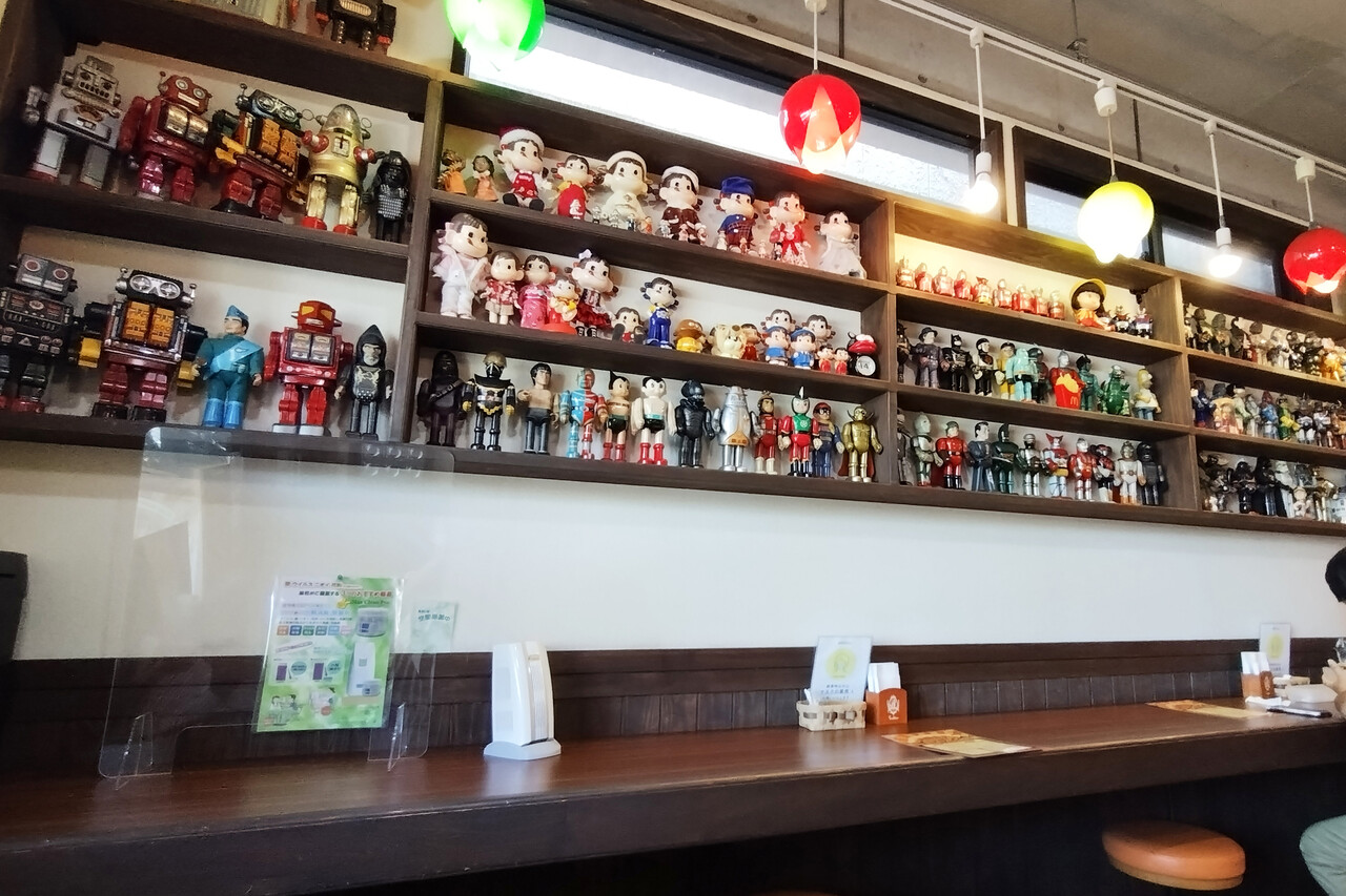 カウンター席頭上には、昔懐かしいソフビの人形やブリキのロボットが沢山飾られています。