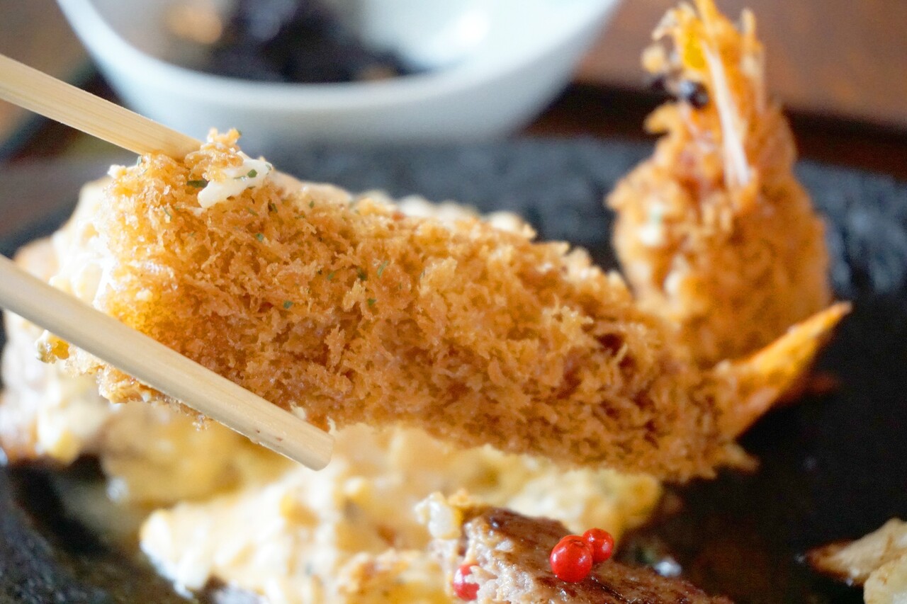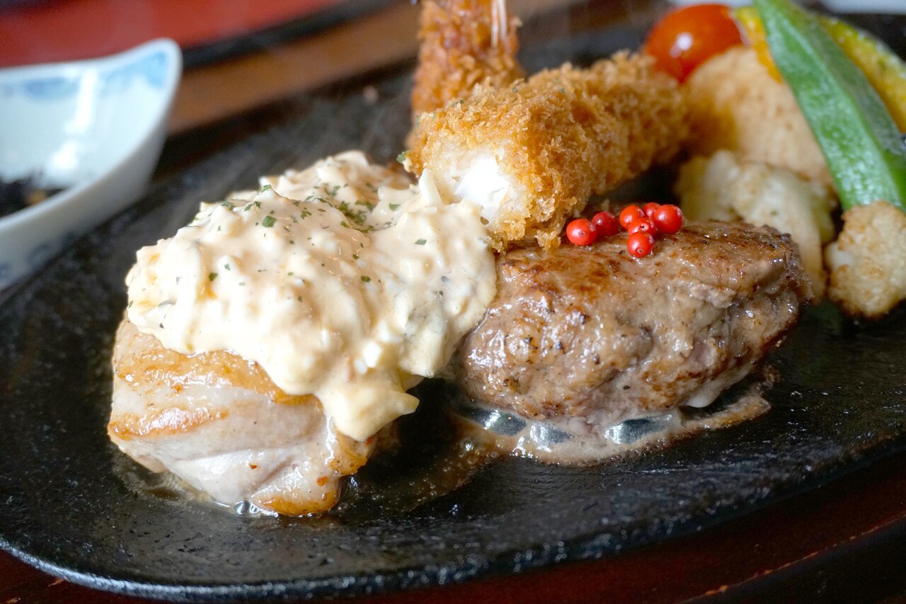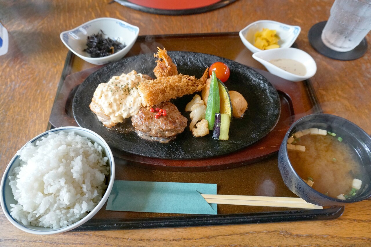 食べ応えのあるエビフライ、ふっくらハンバーグ、特製タルタルがたっぷりかかった南蛮焼き。