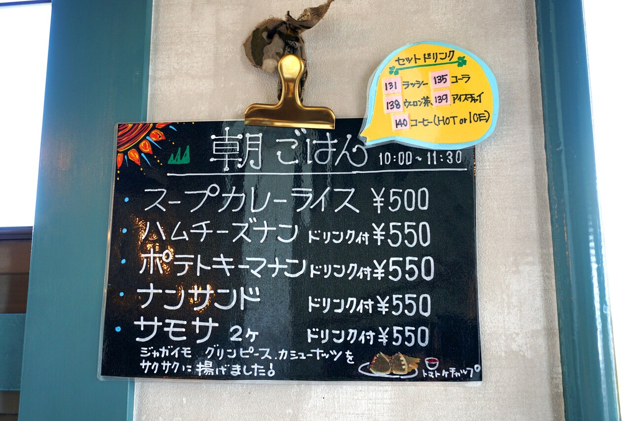 スープカレー、ナンサンド、サモサなどの軽食を頂けます。