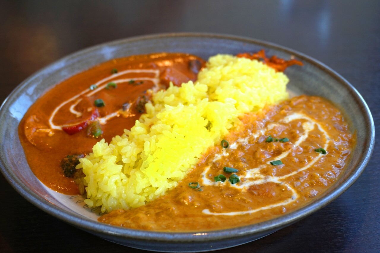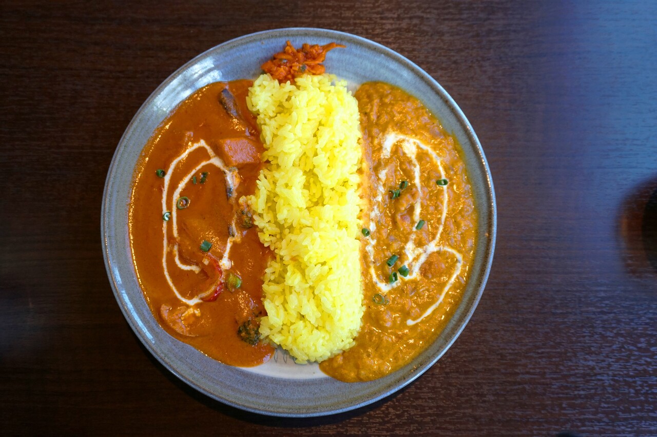 『ダブルカレーライス』は黄色いターメリックライスを真ん中に、2種のカレー。