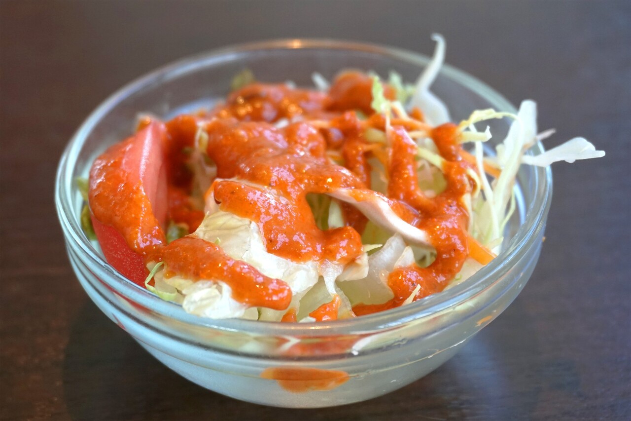 インドカレー屋さん特有のオレンジ色ドレッシングがかかったサラダも付いています。