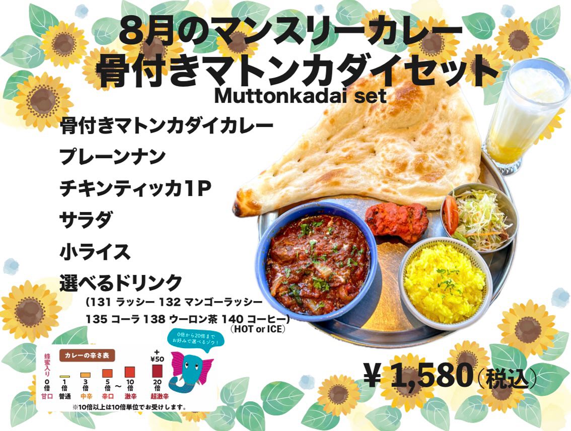 8月は『骨付きマトンとたっぷり野菜入りカレー』でした。
