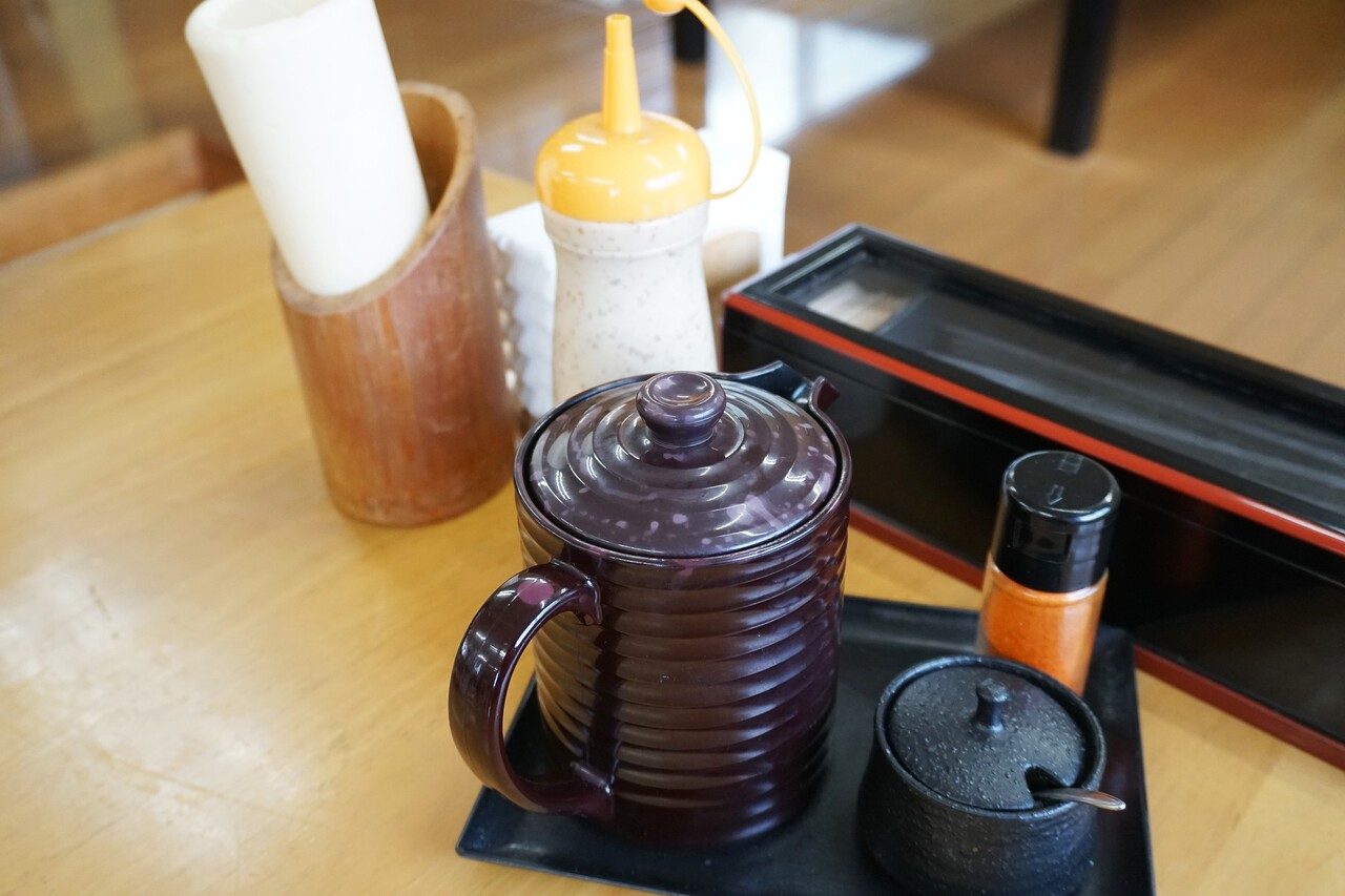 卓上には、ドレッシングや、とんかつソースがスタンバイ。