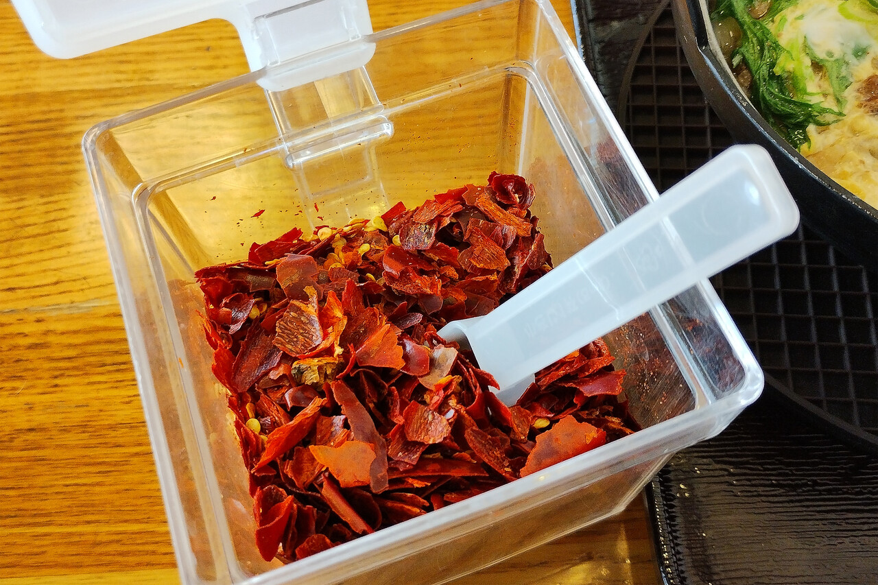 卓上の唐辛子は、粉と粗挽きの2種類。