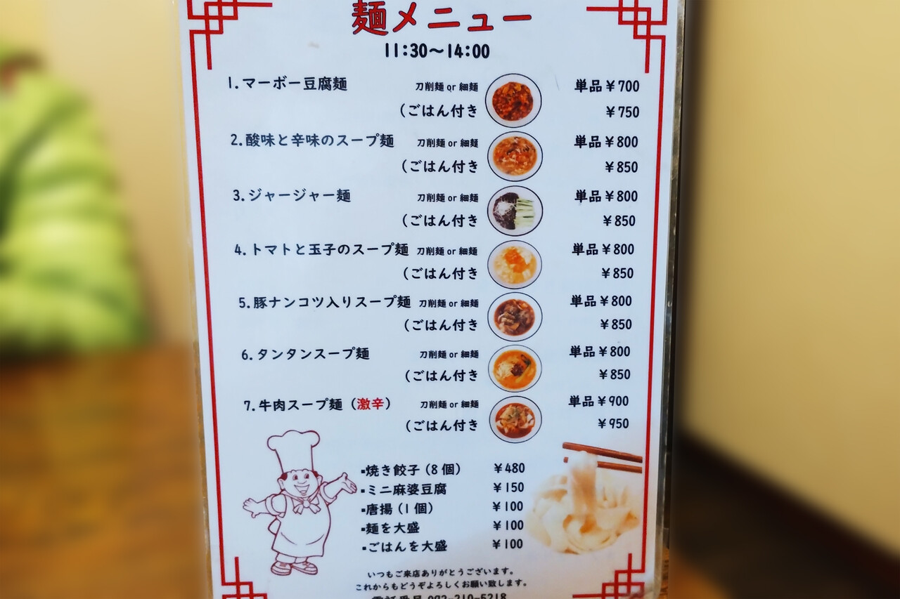 麻婆豆腐はこちらの看板メニューで、『マーボー豆腐麺』700円もありますよ。