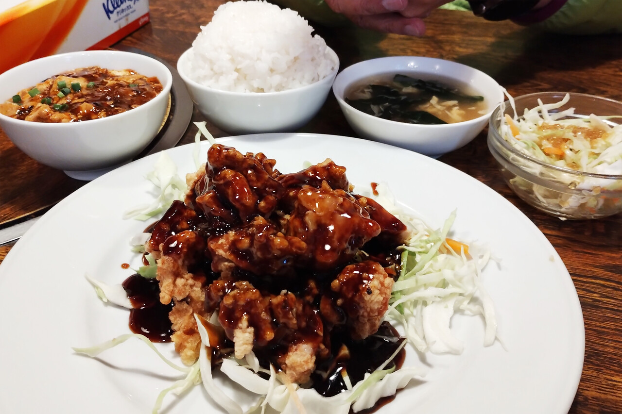 『鶏の唐揚げ黒酢ソース定食』800円。