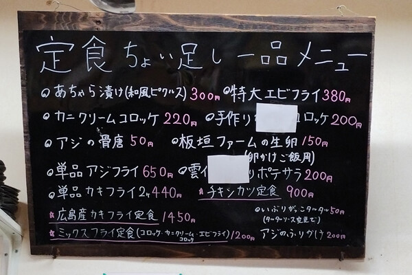 初訪問なら当然オススメは“あじフライ定食”ですが、店内のメニューには他にも各種揚げ物メニューがあります。