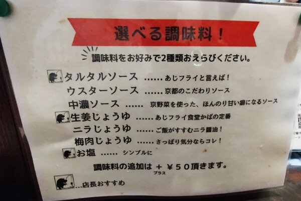こちらでは定番のウスターソースやタルタルソースの他に、各種ソースが選べます。