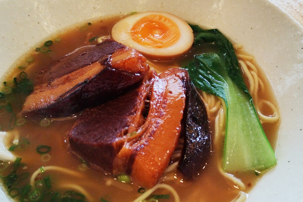 皮付きの角煮が2切れのっており、クセは強すぎないけれど、八角が効いた味付け。