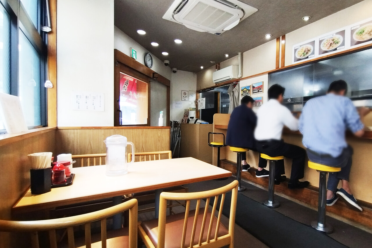 店内はカウンター席とテーブル席、奥に小さな小上がりがあります。