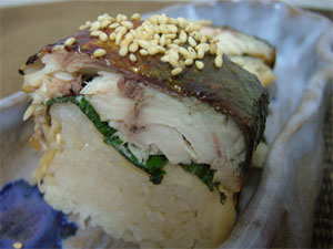 出来上がり〜半日ほど置いて馴染ませた、焼き鯖寿司。