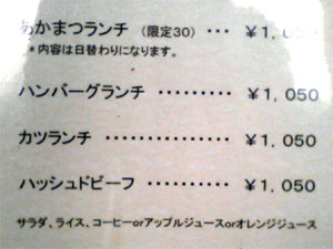 日替わりのあかまつランチ1,050円組とハンバーグランチ1,050円組に分かれる。